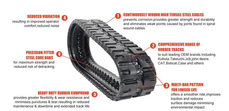 1.Premium engineered rubber compounds ,ensuring rubber tracks are more durable and long-lasting. 2.Common OEM tread design can minimize the downtime of slipping steering. 3.Rich tread pattern style can provides excellent grip. 4.High tensile continuous steel cords to provide excellent resistance to wear and damage. 5.Finest steel components to maximized overall track strength. 6.Perfect for muddy conditions and soft dirt,optimal performance regardless of any obstacles ahead. |